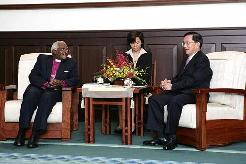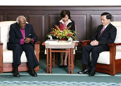 陳總統水扁先生今天下午接見前諾貝爾和平獎得主南非屠圖(The Most Reverend Desmond M. Tutu)總主教夫婦,除代表政府及2,300萬台灣人民表達誠摯歡迎之意外,並與訪賓分享台灣追求二二八事件真相的經驗,希望未來能夠記取歷史教訓、尋求族群和解。