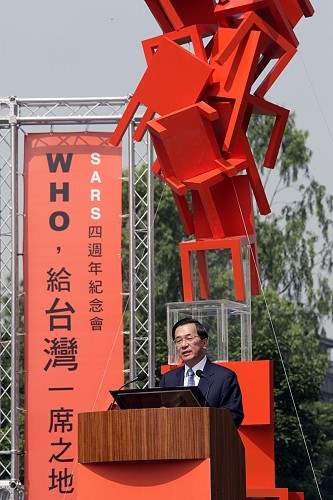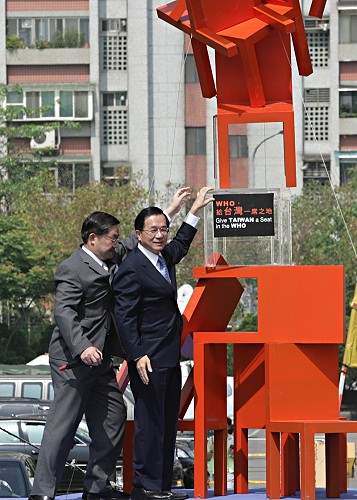 陳總統水扁先生今天上午赴台北國軍松山醫院參加SARS四週年紀念會活動,除應邀致詞,並為紀念SARS四週年所製由椅子堆疊而成的裝置藝術作品放上一片透明壓克力片,象徵希望「國際衛生組織」(WHO)接納台灣成為正式會員。
