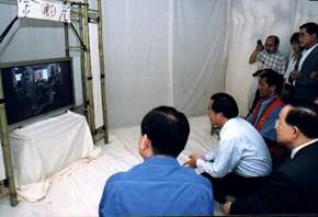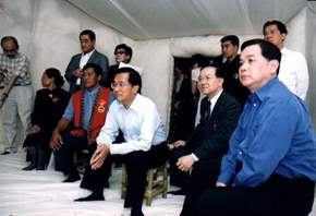 今晚,阿扁懷著高興的心情,踩著輕鬆的腳步,從官邸步行到文化總會,一路穿過了感覺熟悉親切的竹棚架,中途也觀賞了「三顧」的表演活動,最後來到這個充滿了創意和新貌的會場,和大家一起參與「長流----總統文化獎得獎人紀錄影片」的首映典禮,及「布袋金光戲野台」的展出。