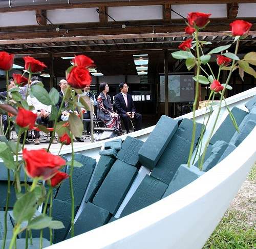 陳總統水扁先生今天下午出席「蔡瑞月舞蹈研究社」開館儀式,除為該社揭幕、致詞,也在陶版上蓋手印留念。