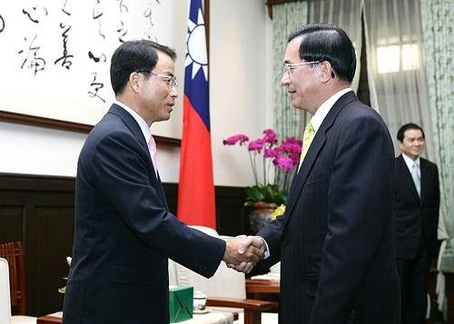 「2007年亞太地區產業高峰論壇」與會外賓,下午由團長韓國前資訊通信部長陳大濟博士(Dr. Daeje Chin)率領,經濟部長陳瑞隆陪同,前來總統府晉見總統,總統府副秘書長陳其邁也在座。
