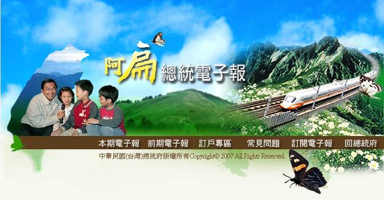 另外,總統府全球資訊網「阿扁總統電子報」專欄也同步改版,首頁設計除了採用和電子報刊頭相同的素材之外,也以總統與小朋友親切互動的圖像,展現總統對國家未來主人翁的重視與關懷,並傳達「世代傳承」、「薪火相傳」的意涵;而整體上「藍天、綠地」的搭配,也呈現出一股清新、簡約的樂活環保風。