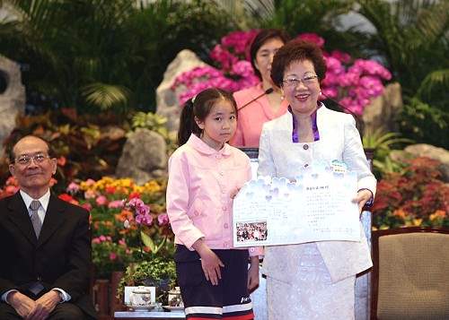 副總統看著她所認養的孩童,有的已長大成人,就讀大學,有的仍是國小可愛學童,她感動地請其中一位─她曾親往探視的試管嬰兒慈恩,以及父母親一同上台,介紹給大家認識,她表示,慈恩是父母親堅持愛心、執著生命下的寶貴禮物,當時她前往探視慈恩時,慈恩的爸媽告訴她需要一位教母,她慨然允諾,慈恩在她懷抱中還是一位小baby,現在已長得好大,讓她看了感慨良多。她並回憶,蘆洲一場大火曾奪走一對小雙胞胎的父母生命,她趕到現場探視,那一對小生命在姑姑的手中,一左一右,無情的大火奪走最親愛的爸媽,她問姑姑是否需要幫忙,姑姑表示會勇敢帶大兩位小朋友,她聽了相當感動,當場答應在兩名小孩成長,上大學前,她一定會盡所能幫忙,現在一對雙胞胎也已長得又健康、又快樂。她環視著自己認養的孩童,7年下來,他們已有自己的天地,也都有很好的進展,看著這些生命的長大, 她心中既滿足又感激。