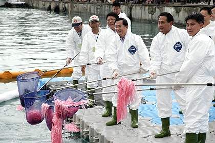 剛剛在我來到小琉球的航程中,瞭解到屏東縣為了打造魚群復育的環境,表達「與大海作朋友」的決心,特別配合農委會漁業署,大力推動人工浮魚礁的投放工作,今天很高興可以躬逢其盛,除了為台灣海洋環境復育作見證,同時也要在此提醒國人,台灣是四周環海的海洋國家,海洋若不健康,台灣就不會健康,因此每個國民都有責任與義務來共同推動海洋生態保育的工作。