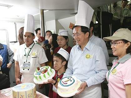 總統並在搭乘的渡輪上,與喜憨兒一起做蛋糕,為喜憨兒及身心障礙同胞來加油,希望透過良好的職業訓練,可以讓他們為自己彩繪美麗的人生;總統也在抵達高雄市真愛碼頭後,贈送糕點、咖啡給喜憨兒代表,作為義賣之用。