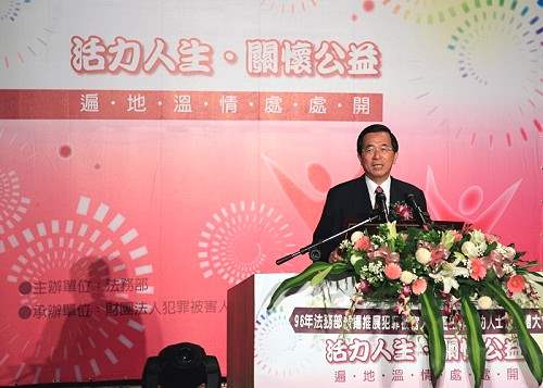 總統是下午在高雄市出席「96年法務部表揚推展犯罪被害人保護工作有功人士及團體大會」致詞時作了以上表示;總統並代表主辦單位頒發獎牌給有功人士及團體代表表達賀意,感謝他們無私的奉獻及偉大的付出,讓台灣的社會更加溫馨祥和。