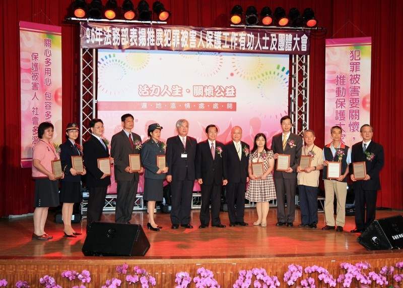 今天非常榮幸能應邀參與「96年法務部表揚推展犯罪被害人保護工作有功人士及團體大會」,看到各位受獎人長期提供犯罪被害人諸多協助並帶領他們撫平傷痛、重建生活,這一種無私無我的精神,實在令人非常感佩。在此謹代表政府及全體國人同胞,向各位有功人士及團體致上崇高的敬意與由衷的感謝之忱。