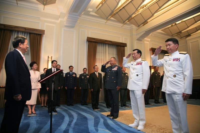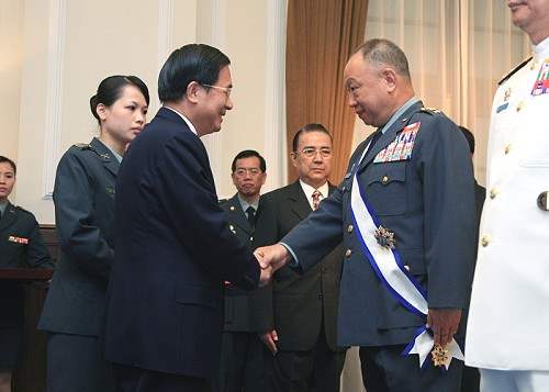 今天非常高興能夠親自頒授軍備副部長朱凱生上將象徵國軍榮譽的二等寶鼎勳章、海軍副總長王立申上將三等寶鼎勳章及授予高廣圻中將晉任二級上將的官階與三等雲麾勳章。