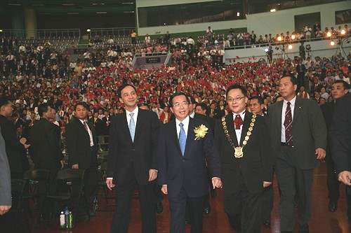 本人自2000年5月20日宣誓就職總統以來,第一場以總統身分參與的國際性會議就是2000年5月27日的高雄西子灣亞太大會。7年來,與台灣青商全體會友相知相惜、相互勉勵,終於能夠再度在青商會年度國際盛會中,與各位見面,本人謹代表台灣全體青商會友,感謝各國青商會員先進們對我們的支持與肯定。
