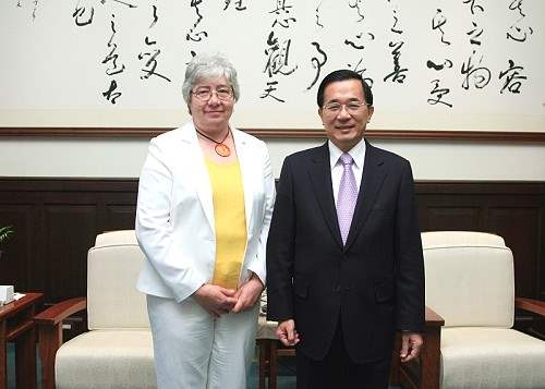 「英國世界唐氏症游泳協會」總會長達特女士,下午由考試院院長姚嘉文、台灣國際身心障礙游泳協會理事長陳恂如陪同,前來總統府晉見總統,總統府副秘書長陳其邁也在座。