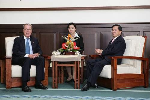 美國在台協會理事主席薄瑞光下午由外交部長黃志芳、美國在台協會台北辦事處處長楊甦棣(Stephen Young)陪同,前來總統府晉見總統,總統府副秘書長陳其邁也在座。