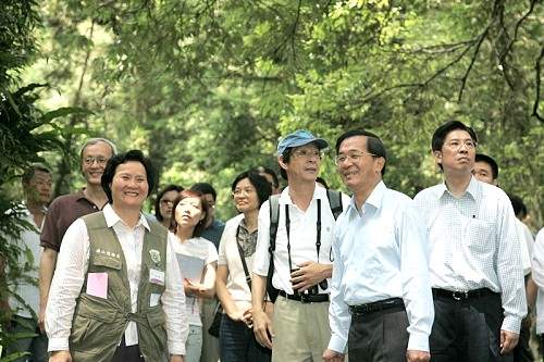 非常高興,能夠跟各位記者朋友,從台北來到宜蘭員山,現在我們所在的位置是台北縣的烏來,非常高興難得有這麼好的機會,進到福山植物園,我們可以作最好的見證,同時也有最深刻的感受,作一個台灣人,真的是福氣,我們看到水蓮花,賞到小鸊鵜,我們也看到很多非常溫馨感人的景象,就在福山植物園,園中的台灣獼猴相互理毛,這麼樣的快樂,甜甜蜜蜜,讓我們好不生羨,這叫做和解共生;當然我們也看到很多的楠樹,或者樟樹,上面長滿了很多的附生植物,多到三十種、四十種、甚至五十種,同一株樹可以長這麼多東西,大家和樂融融,其實這也叫做和解共生。除此之外,我們也看到台灣扁柏、台灣杉,當然就像我們剛才所介紹的,看到台灣山羌、看到台灣獼猴,沒有人想到有一天台灣扁柏會被稱為所謂的「中華台北扁柏」,台灣杉也不可能被改名為「中國台灣杉」,我相信台灣就是我們最親切的名字,也是最真的名字,我們最喜歡的名字,也是一直引以為榮、為傲的名字,不管叫做台灣杉、台灣扁柏、台灣山羌、台灣藍鵲或者台灣獼猴等等。