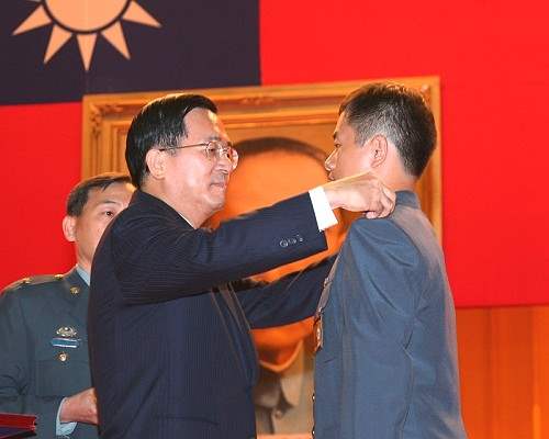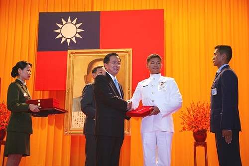 陳總統水扁先生今天上午主持96年三軍五校院聯合畢業典禮,親自頒發畢業證書及授階給畢業學生代表。