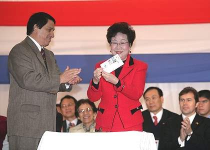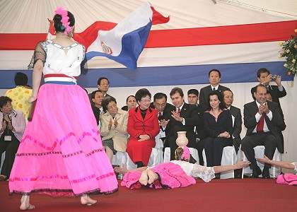 副總統上午與巴國副總統賈司迪優尼(Luis Alberto Castiglioni)共同主持「台巴建交50週年慶祝系列活動」。致詞時,副總統首先感謝巴拉圭人民對她及訪團的熱烈歡迎,並表示,今天在風雨中慶祝台巴兩國建交50年,誠如賈斯迪優尼副總統所言,雨水在巴拉圭象徵上天賜給農作物的甘露,很高興能在天降甘霖的情況下參加今天的盛會。此外,她認為今天的雨水還象徵其他的意義:首先,她是代表陳水扁總統及2,300萬台灣人民來參加慶典,所以她把「水」帶來了;而風雨交加中,台巴兩國共同回顧雙方的友誼,更讓人彌足珍惜。