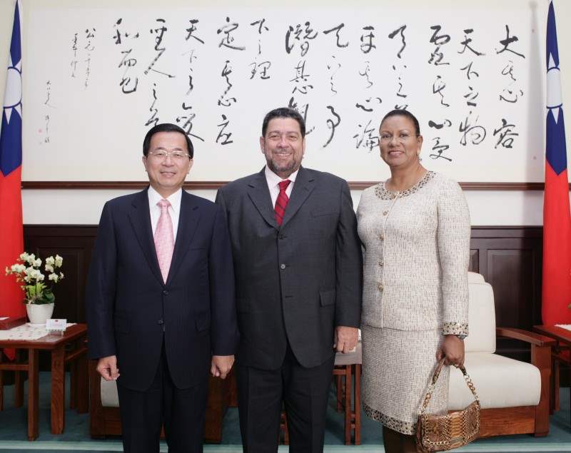聖文森總理龔薩福伉儷下午由外交部次長侯清山陪同,前來總統府晉見總統,總統府副秘書長陳其邁也在座。