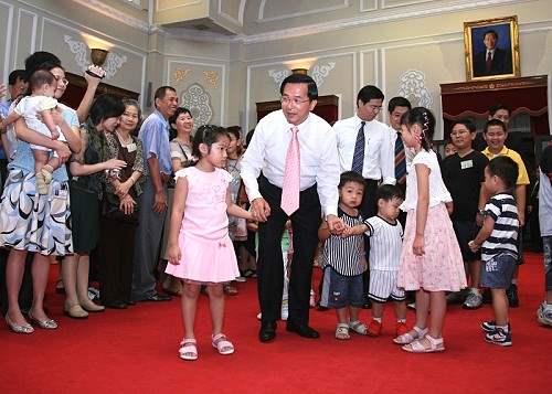 總統於茶敘中場來到會場,與參加總統府親子日的同仁、眷屬們同歡,除親切地和在場每一位大、小朋友握手、寒暄,受到大家熱情歡迎,並於致詞後與大家合影,也很有耐心地答應同仁與眷屬們索取簽名的要求。