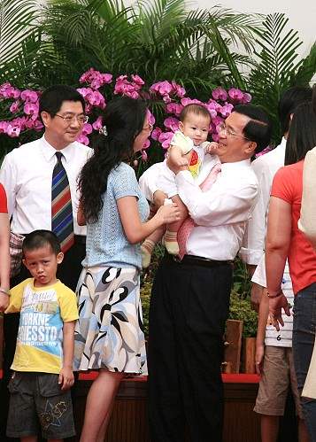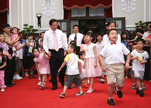 今天又是總統府一年一度舉辦員工親子日活動的好日子,也是總統府一年當中最溫馨、最熱鬧的一天,能再度和這麼多可愛的小朋友見面,本人真的非常高興,首先預祝各位同仁、先進、各位爸爸媽媽、大朋友、小朋友,都能夠享受「溫情總統府、快樂親子日」。兩天前剛好是八月八號父親節,本人也要祝福在場及全國的爸爸們「父親節快樂」。