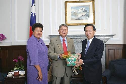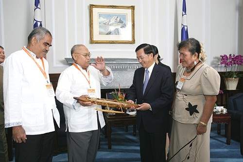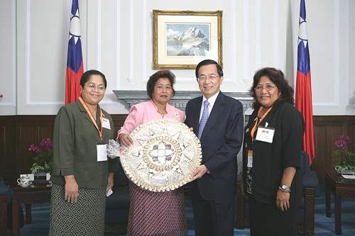 陳總統水扁先生今天下午在總統府接見帛琉共和國副總統陳嵌薩(Elias Camsek Chin)、馬紹爾群島共和國第一夫人瑪麗諾特(Mary N. Note) 及吐瓦魯國會議長拉達士(Kamuta Latasi),對於訪賓再次應邀蒞訪並率團參加民主太平洋聯盟大會,代表政府及台灣2,300萬人民表達誠摯的歡迎及感謝之意。