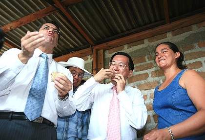 由於該農戶女主人擅長製作宏國當地點心玉米餅,總統與桑多士副總統也當場品嚐包有紅豆餡的玉米餅,同聲表示「好吃」,現場一片歡樂氣氛,也讓宏國午後的農莊充滿兩國熱情的交流與互動。總統與桑多士副總統也在農家主人引導下,來到莊園取用芭樂,Julio先生並感謝總統及台灣政府對宏國農家的技術協助,讓他們的生活環境獲得改善,他們銘感在心;總統則表示,好東西要與好朋友分享,能將台灣芭樂帶進宏國友邦,讓當地農家能擁有更好的生活條件,今天親自前來見證,內心感動萬分。