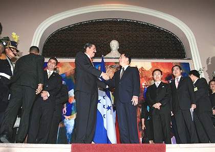 這次率團訪問宏國,是本人繼2001年6月之後第二次的到訪,內心感到無比的高興。6年多前只有短短一天的訪問,這次前後共計四天,是本人歷次出國訪問時間最長的國家。一方面是應最敬重的賽拉亞總統閣下的邀請前來宏國進行國是訪問,另外一方面也是要與中美洲國家暨加勒比海區域的元首們,共同參加「第六屆台灣與宏都拉斯、貝里斯、薩爾瓦多、瓜地馬拉、尼加拉瓜、巴拿馬及多明尼加元首高峰會」。