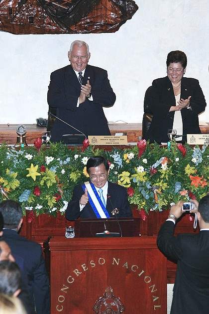陳總統水扁先生「共創宏景、永續關懷」之旅,今天上午宏國時間10時許(台北時間23日凌晨零時)應邀於宏國國會發表演說,並接受國會議長米契列地(Roberto Micheletti Bain)贈予特種大十字金質勳章(Gran Cruz Extraordinaria de Placa de Oro)。