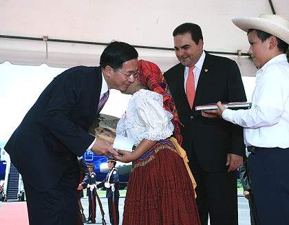 這是本人自2000年擔任總統以來第13次出訪,承蒙貴國薩卡總統閣下、副總統艾斯柯芭閣下、國會議長歐雷雅那閣下、最高法院院長賈西亞閣下,也就是「行政」、「立法」、「司法」三權最高首長,都親自來到機場迎接我們並舉行隆重的軍禮歡迎儀式。這不但是本人十三次出訪所接受到最盛大、最隆重的歡迎儀式,在薩國來講,也是給予外國來訪元首的最高禮遇,我們非常感激。
