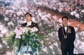 這次大會活動能在台南新營舉行,我們要特別感謝陳唐山前縣長和現任蘇煥智縣長的支持及努力,同時,阿扁知道我們蘇縣長正帶領著縣府團隊,為台南縣轉型為人文與科技兼容的現代都會而努力打拚著,尤其是著手展開台南科學園區的招商行動。阿扁在這裡,也要拜託我們所有的青商人,透過我們青商會的組織與管道,配合政府「深耕台灣、佈局全球」的經濟策略,協助南科招商,將台灣與台南未來的商機傳播出去,與國際友人一同進駐南科,共同打造南台灣的這座新科技希望之星。