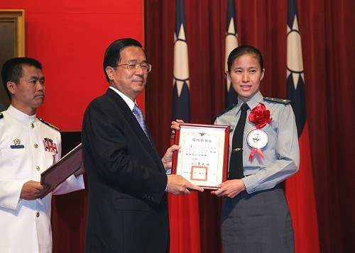 今天非常高興,再一次在呂副總統的陪同下,主持一年一度慶祝「九三軍人節」的盛會,親自向當選國軍楷模、模範團體主官、敬軍模範以及「全民國防教育傑出貢獻獎」的得獎人,表達由衷的肯定與嘉勉之意,同時也要向在背後默默支持、鼓勵的各位寶眷們,致上最高的敬意與祝賀之意。