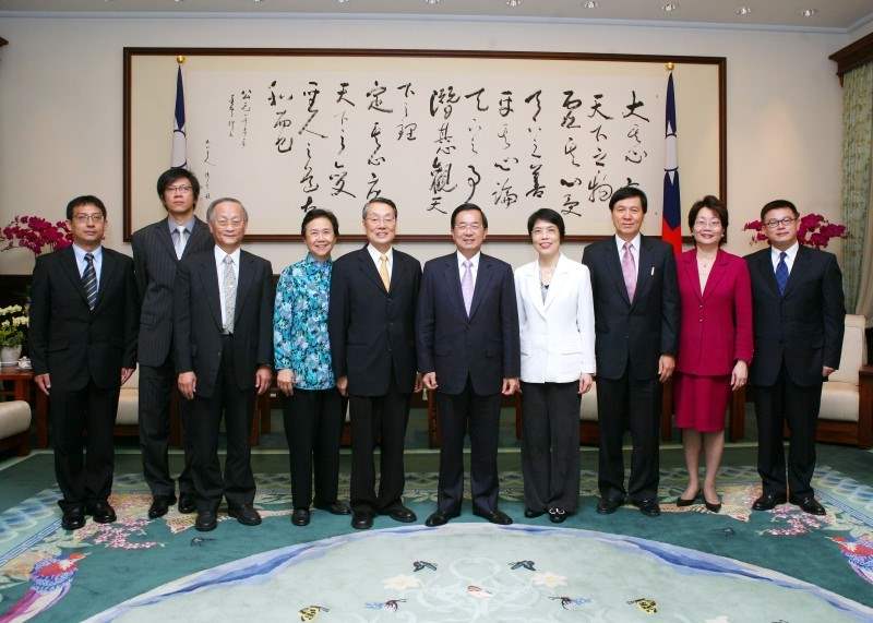 我國參加APEC 非正式經濟領袖會議代表團包括領袖代表施振榮董事長及夫人、行政院經濟建設委員會主任委員何美玥、台灣經濟研究院院長洪德生、國家安全會議副秘書長裘兆琳、行政院新聞局副局長易榮宗、台灣大學教授李源德、智融品牌管理顧問公司副總經理葉光章、智融基金會副執行長林信昌,上午前來總統府晉見總統,總統府副秘書長陳其邁也在座。