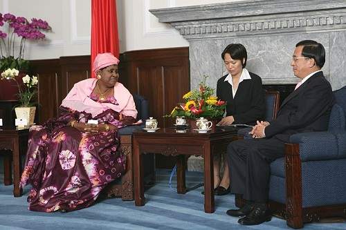 甘比亞共和國副總統賈莎迪女士及訪團,下午由外交部部長黃志芳陪同,前來總統府晉見總統,總統府秘書長葉菊蘭也在座。