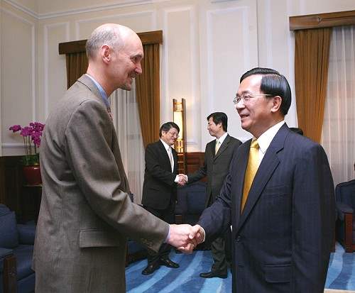 「西藏人權問題國際研討會」訪問團,包括國際聲援西藏組織主席艾克利(John Ackerly)、國際人權無疆界組織主席法奧特(Willy Fautre)、美國國家諮詢委員會東亞人權事務顧問司馬晉(James Seymour)、國際漢藏協會會長薛偉、紐約西藏論壇主編Tashi Dongchu及奧林匹克觀察員Barbara Lobel,上午在蒙藏委員會委員長許志雄陪同下,前來總統府晉見總統,總統府副秘書長陳其邁也在座。