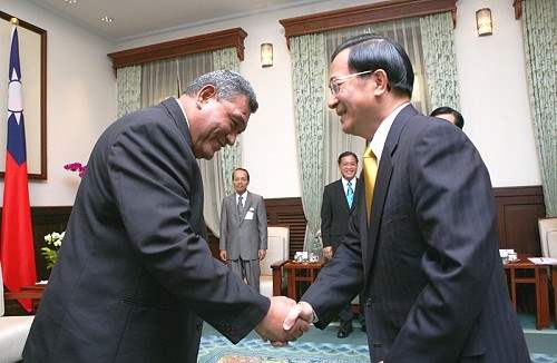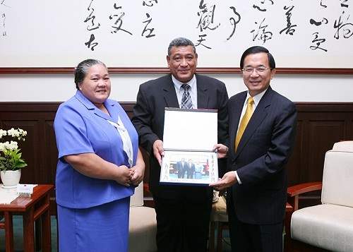 陳總統水扁先生今天上午在總統府接見吐瓦魯總理葉雷米亞(Apisai Ielemia)伉儷,對訪賓遠道來台訪問,代表我國政府與2,300萬人民表達竭誠歡迎之意。