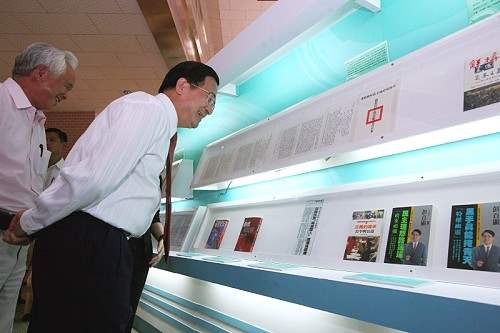 陳總統水扁先生今天上午在台中市以象徵「捍衛國家資產大門、揭開不當黨產黑幕」高呼-「全民討黨產」口號等方式,為「清查不當黨產、捍衛國家資產檔案巡迴展」揭幕,揭幕後總統並參觀巡迴展。