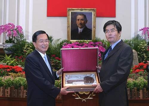 「921地震63處集合式住宅都市更新會理事長及總幹事」今天上午由九二一基金會執行長謝志誠帶領,前來總統府晉見總統,總統府副秘書長卓榮泰也在座。