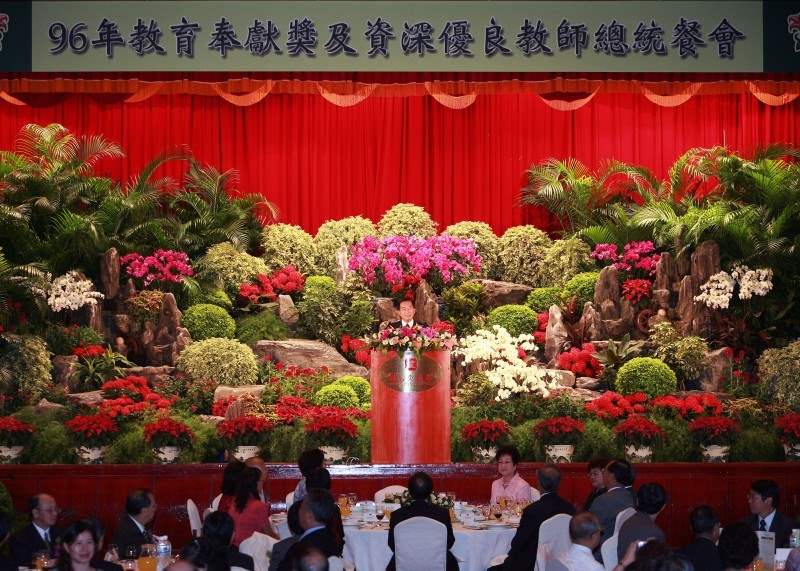 在一年一度教師節的今天,陳總統水扁先生偕同呂副總統秀蓮女士特別在台北圓山飯店宴請「第二屆教育奉獻獎得主及資深優良教師」,代表政府向平日辛勞的全國教育工作者,以及在場的教育奉獻獎得獎者及資深優良教師,表達最高的尊敬與感謝之意,感謝他們長期以來對教育工作無私的付出、熱誠的奉獻。