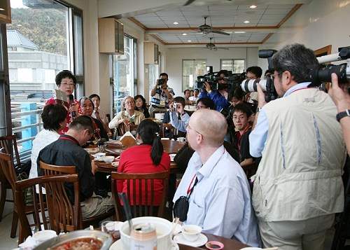 中午,副總統則與國內外媒體餐敘。席間她展示了「重審美麗島」一書,並表示,從228事件到美麗島事件,台灣歷經長達38年的戒嚴,期間也發生了很多迫害人權的政治事件,當時有很多連記錄都無處可尋,後經文建會有系統地將這些事件加以重新蒐集整理,才得以保存。2000年政黨輪替後,陳總統和她都非常重視人權議題,總統並指派她擔任總統府人權諮詢委員會主任委員,以展現對人權的尊重,並記取過往的教訓,為日後深化及保障人權開展新局。此外,副總統也展示兩本由她所寫作的小說,「這三個女人」與「情」,其中,「這三個女人」目前正改編為電視劇,由台視積極籌拍中。她說,她走過的路就是台灣人走過的路,就是整個台灣人的故事。