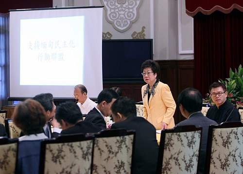 「支援緬甸民主化」行動聯盟參與單位包括台灣民主基金會、國際特赦組織、台灣婦女團體全國聯合會、中國人權協會、民主進步黨等30個以上團體,他們不分彼此,就是希望能將台灣民主化經驗與世界分享,讓民主的花朵在世界各個角落綻放。