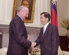 陳總統水扁先生今天上午在總統府接見國際大學運動總會會長喬治克利安(George E. Killian)等一行,並代表中華民國政府及人民歡迎他們遠道來訪。