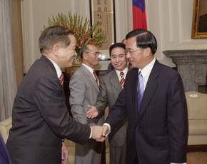 陳總統水扁先生今天上午接見台灣張廖簡宗親全國總會卓越貢獻代表,除對他們獲選為張廖簡宗親全國總會優秀代表表達祝賀外,也對他們在各行各業中的傑出表現表達肯定與嘉許之意。
