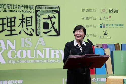 總統府葉秘書長菊蘭今天下午出席在總統府北苑舉辦的「台灣公共圖書館的新世紀特展:樂讀理想國Taiwan Is A Book Country」記者會,除應邀致詞並與行政院文化建設委員會主任委員翁金珠共同體驗自助借書的樂趣,隨後在大型借書證上簽名,象徵看完一本「樂讀理想國」的書,為特展揭開序幕。