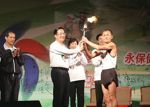 在同樣手持聖火的觀禮民眾掌聲中,及呂副總統、總統府秘書長葉菊蘭、副秘書長陳其邁與體委會主任委員楊忠和陪同下,總統應邀致詞。致詞內容為: