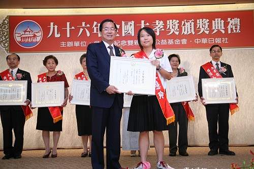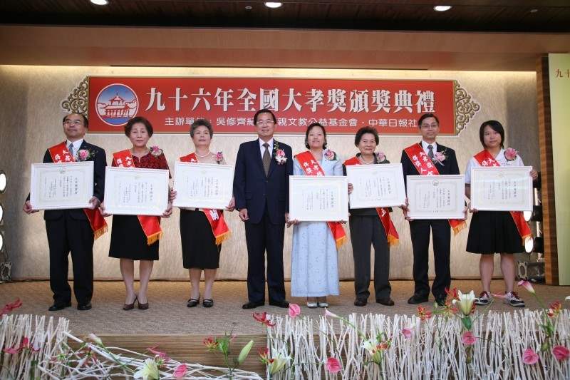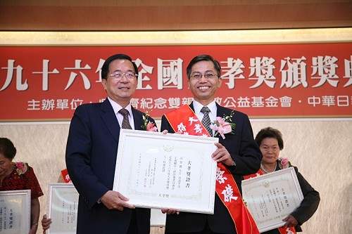 恭喜今年當選的七位得獎人,各位的孝行事蹟令人感動,特別值得一提的是,七位得獎人當中有多位本身已經是上了年紀的人,卻仍然無微不至地照料自己年歲更高的父母親,像高榮礎先生已經57歲,照顧98歲的老母親;陳玉女女士67歲,照顧105歲的人瑞母親;林陳金蘭女士63歲,照顧90歲的婆婆;黃錦玉女士70歲,照顧97歲的高齡母親。證明了只要有心,每一個人都可以行善盡孝,各位絕對是全國為人子女心目中至高的榜樣與典範。