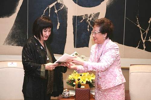 呂副總統秀蓮女士今天下午在總統府接見楊麗花歌仔戲團,除親自贈送楊麗花女士「世界之女」一書之外,並在書上提字「歌仔戲之光」,以表彰楊女士對台灣傳統戲劇的付出與貢獻。