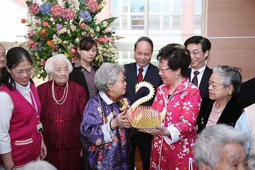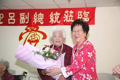 隨後,副總統接受高齡95歲的阿嬤獻花並聽取簡報,她表示,近年來在「少子女化」及「人口高齡化」的影響下,人口結構有了很大的改變,逐漸成為一個嚴肅的課題,65歲以上的老人將近250萬。她呼籲老人家們要活得「愈老愈年輕」,雖然歲數沒有辦法改,但我們更要讓自己的身心靈愈來愈年輕。