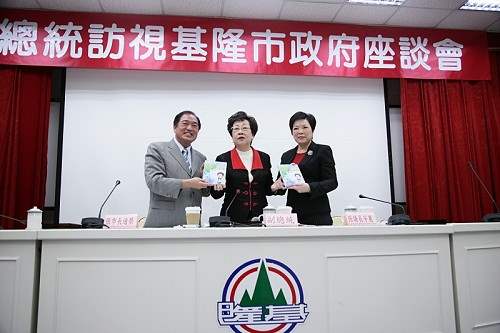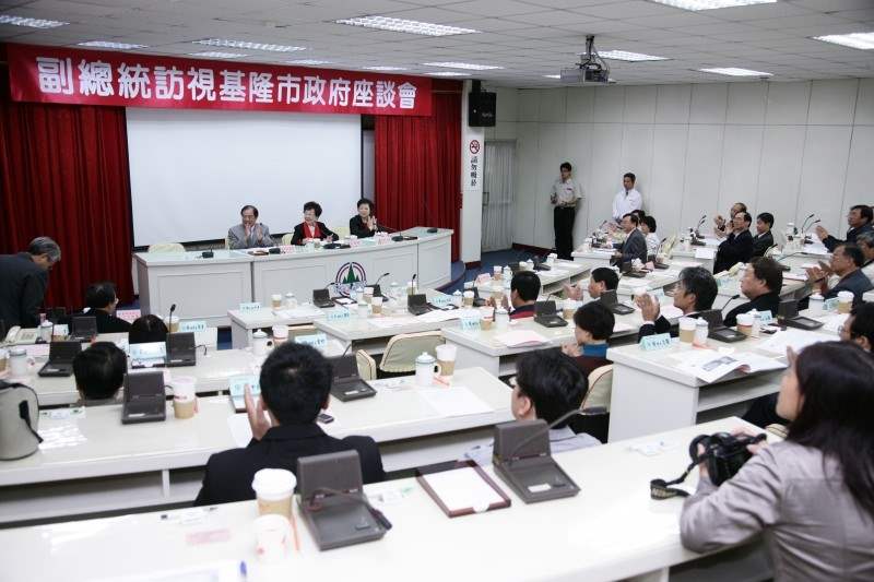 副總統在視察基隆市政府時,由張通榮市長、基隆市議會議長張芳麗陪同,與地方人士及市政府各單位代表進行座談,聽取他們針對市政建設所提出的多項意見,隨後並請與會的中央政府機關,包括環保署、教育部社教司、海博館籌備處及財政部國庫署等單位代表作出回應,繼由副總統總結致詞。