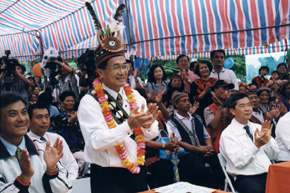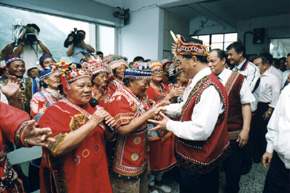 陳總統水扁先生今天上午在參觀過國立海洋生物博館後,隨即轉往屏東縣牡丹國小拜訪牡丹舊部落耆老。當總統偕同原住民委員會陳建年主委、屏東縣蘇嘉全縣長抵達牡丹國小時,原住民鄉親和牡丹國小師生們以迎賓舞曲表達熱情的觀迎。之後,並由排灣族女巫師們進行祈福儀式,祈祝國泰民安。總統也一一與鄉親們合影留念。