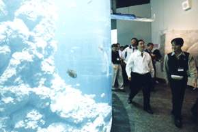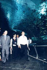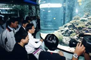 陳總統水扁先生今天上午在屏東縣蘇嘉全縣長等人的陪同下,前往屏東縣車城鄉參訪國立海洋生物博物館,除聽取由方力行館長所作的簡報外,也實地參觀海生館二館-珊瑚王國。對於海生館全體同仁的努力成果,總統也表達肯定和感謝,並期勉他們要「腳步站乎在,堅定看未來」,為海生館未來發展再建一個新的里程碑。