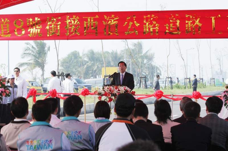 今天很歡喜能再回到台南參加「國道8號連接西濱公路道路工程」的通車典禮,這也是剛才蔡部長所說,本人最近兩個月以來所參加重大交通工程通車典禮的第四次,特別要對咱台南地區的鄉親耆大表示恭喜,也要對工程相關單位以及同仁的努力與辛苦表示感謝。