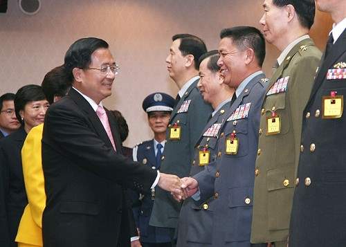 今天很高興在呂副總統的陪同下,再度主持國軍陸、海、空軍將級軍官的晉任授階典禮。首先要向榮升的將軍以及各位寶眷們表達最誠摯的祝賀與嘉勉之意;各位都是國家最優秀的幹部,今天各位的晉任,代表多年的努力獲致肯定,但同時也代表各位將肩負更多的使命與責任,希望大家能秉持過去一貫的精神,在工作崗位上善盡職責,把付出視為榮耀、把任務當作使命,全心全力保衛台灣2300萬人民的安全與福祉。