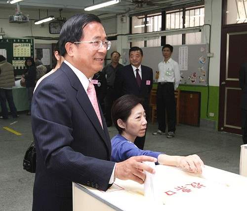 總統暨夫人吳淑珍女士上午偕家人,前往設籍地投開票所民族國小投票,中央選舉委員會主任委員張政雄、總統府副秘書長林佳龍等人在場陪同。